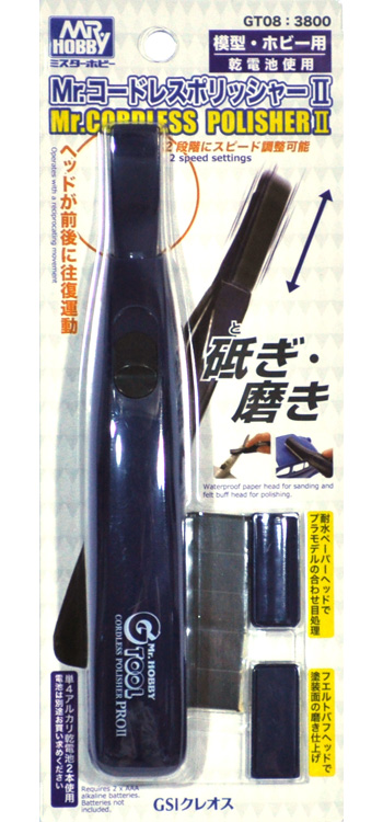 「Mr.コードレスポリッシャー 2 ヤスリ (GSIクレオス Gツール No.GT008 )」です●GSIクレオス製「Mr.コードレスポリッシャー 2 」の価格改定版リニューアルアイテムになります。 Mr.コードレスポリッシャー 2 (GT08) 概要●種類 : 電動サンダー (往復運動) ●研磨 ・ 400番 (別売りのヤスリ交換で番手の変更可能) ・ フェルトバフ ●電源 : 単4アルカリ電池 2本 (別売) Mr.コードレスポリッシャー 2 (GSIクレオス Gツール GT08) 製品内容●「Mr.コードレスポリッシャー 2」は、ヘッド部分が前後に往復運動して、サンドペーパーによるヤスリがけ作業、塗装面の磨き仕上げ作業の効率化を図る事ができる電動ツールです。 ●ハイパワーモーターの採用により、強いトルクでヘッドが前後に可動、先端に「サンドペーパー」や「フェルトバフ」などを取り付けて「削る」「砥ぐ」作業を効率よく行うことができます。 ■ 2段スピード/スイッチ切替は手持ちのまま ●「Mr.コードレスポリッシャー 2」は手に持ったままスイッチの切替ができます。 ・ 切り替えの種類は、電源の「オン(ヘッドスピード Low)」「オフ」「ヘッドスピード High」の3パターンを設定、作業中手を放さずに工作作業を続けることができます。 ■ コードレスで作業場所を選びません ●「Mr.コードレスポリッシャー 2」は単4電池2本を使用、電源コードを気にすることなく、作業場所を選ばずに手軽に切削、磨き作業をする事ができます。 ■ ヘッド交換式で多様なヤスリを使えます ●ヘッド部分は2種類の「アタッチメント」パーツの交換式、作業目的によって交換して使用します ● アタッチメントの種類は ・ 平型アタッチメント : 平面加工に使用します ・ ラウンドアタッチメント : 曲面や凹部分の加工に使用します の2種類をセットしています。 ●作業目的に応じて、「アタッチメント」パーツに「サンドペーパー」「フェルトバフ」を貼り付けて使用します ・ 本製品には「耐水ペーパー #400」が付属していますが、このほか「Mr.コードレスポリッシャー 2」に対応した交換用のオプションパーツもございます(別売り)。 Mr.コードレスポリッシャー 2 (GSIクレオス Gツール GT08) 製品仕様●製品仕様 ・ 本体重量 : 60g (電池別) ・ 本体寸法 長さ168mm×幅 25mm×高さ25mm ●仕様電源 : 単4アルカリ乾電池×2本使用(別売) Mr.コードレスポリッシャー 2 (GSIクレオス Gツール GT08) パッケージ内容●Mr.コードレスポリッシャー 2 本体 ×1 ●平型アタッチメント ×1 ●ラウンドアタッチメント ×1 ●#400耐水ペーパーシート ×10枚 (裏面シール付) ●フェルトバフ ×5枚 ●ご使用前に、必ず付属の説明書や安全についての注意書きをよくお読み頂いてからご利用下さい。