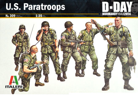 「アメリカ 空挺兵セット プラモデル (イタレリ 1/35 ミリタリーシリーズ No.0309 )」です●第2次世界大戦時におけるアメリカ軍の空挺部隊の兵士6体を1/35スケールで再現したプラスチックモデル組立キット ●空挺降下した後に、戦場において行動中のシーンが表現されています 【 「アメリカ軍の空挺部隊」について 】●アメリカ軍の空挺部隊は、まず第82空挺師団が編成され、シシリー戦などの投入、空挺部隊としての運用方法が確立されて行きました ●次に編成されたのが第101空挺師団で、この師団はノルマンディ上陸作戦用として創設されたもので、第82空挺師団と第101空挺師団の両師団は、1944年6月6日の未明に上陸部隊の前進路を確保するためにノルマンディ海岸の内陸部に投入されました ●ドイツ軍は、上陸作戦が行われる際には、空挺部隊が内陸部に降下するものと考えており、内陸部には湿地帯の設置やグライダー降下を防ぐためのバリケードが設けられ、第82空挺師団と第101空挺師団の各師団は大きな損害を受けてしまいます ●特に問題だったのが高射砲の妨害や未熟な輸送機パイロットによって、部隊が目標地点から大きく外れて降下してしまったことですが、空挺部隊の兵士は事前にそのような事態を想定した訓練を行っていたことによりこれを克服、上陸作戦成功に大きな貢献をしたのでした ●ちなみに、第101空挺師団の一部の兵士は自身の勇猛さを演出するために頭髪をモヒカン刈りとしており、本キットにはそのような兵士を再現することができます 【 「アメリカ 空挺兵セット」のキット内容について 】●この第2次世界大戦時におけるアメリカ軍の空挺部隊の兵士を再現したプラスチックモデル組立キットです ●旧イタラエレイ社時代に製品化されたフィギュアセットで、現在の目で見ると顔の造りなど時代を感じさせますが、その汎用性の高いポージングにより、アメリカ空挺部隊兵士のフィギュアとして定番的なアイテムとなります ●空挺降下後の戦場において、射撃や移動、指揮などの戦闘行動中のシーンが再現されています ●服装は、「M42空挺部隊用野戦服」を着用、降下兵用の戦闘靴を履いた姿です ・ ボックスに描かれているように、3体のフィギュアは無帽の状態でモヒカン刈りのヘッドを露出している姿です ・ 「M42空挺部隊用野戦服」はノルマンディ戦までの服装で、この作戦から後は「M43野戦服」に変更されています ●フィギュアは、胴体、両足に分割したオーソドックスなパーツ構成です 【 「アメリカ 空挺兵セット」のフィギュアのポージングについて 】●セットされているフィギュアのポーズは6体、6種類 ・ 片手に「M1 カービン」を持って歩いているポーズ ・ 片膝を付いた姿勢で、両手で「M1 トンプソン サブマシンガン」を持ち、無線機を背負っているポーズ ・ 立った姿勢で、片手に「M1 カービン」を持ち、もう一方の手で無線機の受話器を持って通話しているポーズ ・ 立った姿勢で、両手で「M1 トンプソン サブマシンガン」を持って、腰だめの状態で射撃しているポーズ ・ 立った姿勢で、片手に「M1 カービン」を持ち、もう一方の手を前方に指差して指示しているポーズ ・ 立った姿勢で、片手で「M1 トンプソン サブマシンガン」の銃口部分を持ち、ストックを腰の位置に置いてホールドしているポーズ となっています 【 付属している装備品類 】 ・ M1 トンプソン サブマシンガン ×3 ・ M1 カービン ×3 ・ M1 トンプソン サブマシンガン用マガジンポーチ ×3 ・ 拳銃ホルスター ×2 ・ 銃剣 ×6 ・ 手榴弾 ×8 ・ ヘルメット ×6 ・ 水筒 ×6 ・ 携帯シャベル ×6 ・ 無線機 ×1 など 【 「アメリカ 空挺兵セット」のパッケージ内容 】・ フィギュア ×6 ・ フィギュアの装備品類一式 ●再販アイテム