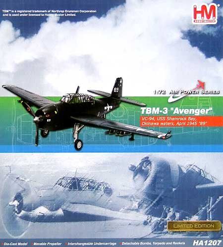 「TBM-3 アベンジャー シャムロック・ベイ搭載機 完成品 (ホビーマスター 1/72 エアパワー シリーズ (レシプロ) No.HA1207 )」です●「TBM-3 アベンジャー シャムロック・ベイ搭載機」を1/72スケールで再現したダイキャスト製彩色済完成品モデル●アメリカ海軍「空母 シャムロックベイ」搭載、「VC-94」所属の「TBM-3 アベンジャー (89)」、1945年4月頃に見られた姿を再現した内容となっています ●主翼下にレーダーを設置した「TBM-3 アベンジャー」の機体形状を、シャープなパネルラインを彫り込んだ形で再現 ●機体全体にシーブルーで塗装を施された機体を再現、機体番号、国籍マークなども再現されています ●キャノピーはワンピースタイプ ●主脚と尾輪は展開状態と収納状態の2種が付属、飛行状態と地上待機状態のいずれかを再現する事ができます ●プロペラは回転させることが可能 ●機体下面のウェポンベイはパーツの差し替えにより開閉状態を再現する事ができ、付属の魚雷もしくは爆弾を収納させる事ができます ●付属の武装として ロケット弾 ×8 航空爆弾 ×4 魚雷 ×1 が付属しています ●飛行姿勢で飾る事ができる「ディスプレイスタンド」が付属 ●彩色済完成品モデル