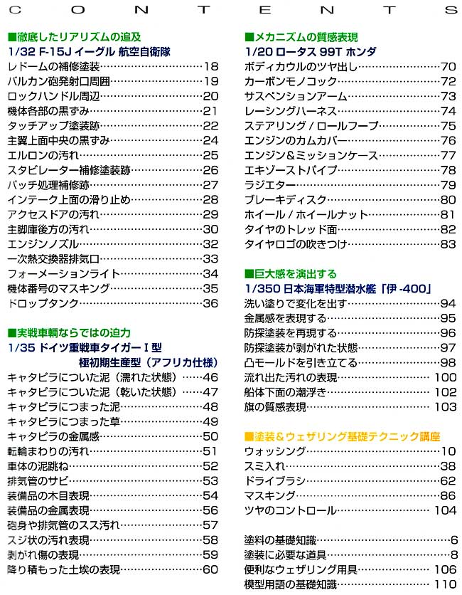 ●どこのプラモデル屋さんでも入手ができるであろう「タミヤ製キット」を題材に、「飛行機」「戦車」「F1(車)」「艦船」のジャンルごとに、様々な塗装表現を行程過程の写真とテキストで解説