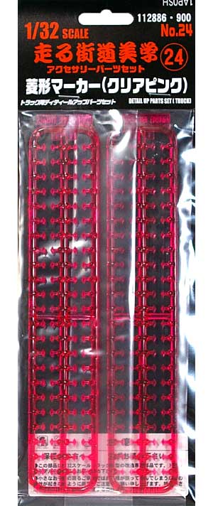 「走る街道美学 24 菱形マーカー (クリアピンク) プラモデル (フジミ 1/32 走る街道美学シリーズ No.024 )」です●「走る街道美学 24 菱形マーカー (クリアピンク)」です ●1/32スケールのトラックモデル等用のデティールアップパーツセット ●トラックモデルをデコレーションする「菱形マーカー」を透明パーツで再現しています ●クリアーで成型された菱形マーカーのパーツは、台座(枠)の部分が彫刻で再現されていますので、シルバーなどの塗料で台座部分の塗り分けを行い、よりリアルな「菱形マーカー」を再現する事が可能です ●お好みの場所に取り付けて、トラックモデルを飾って下さい ●極少サイズのクリアパーツですので、トラックモデルだけでなく1/144~1/100スケールのキャラクターモデルなどにも転用する事ができます ●成型色 : クリアピンク ●セット内容 ・ 菱形マーカー (クリアピンク) ×92個 ●各パーツのサイズ ・ 菱形マーカー : 約3×1.5mm (横幅×縦幅)