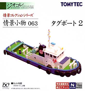 「タグボート 2 プラモデル (トミーテック 情景コレクション 情景小物シリーズ No.063 )」です●1/150スケールの「Nゲージ」サイズで展開する「情景コレクション」、港や大きな河口などで活動する「タグボート」を1/150スケールで再現した「タグボート 2 (船底青)」です ●「建物コレクション」や「情景コレクション」などと共に、1/150スケールのNゲージサイズの建物・構造物として活用する事ができる接着剤不要の組立キットが「情景コレクションシリーズ」です ●私たちが生活する街の中で見かける風景を再現するため、建物を始めとした多種多様な街の構成要素を手軽に再現する事ができます ・ パーツ類は既に塗装済となっていますので、組立てるだけで1/150スケールのストラクチャーが完成します ●1/150スケールですので、Nゲージだけでなく、他のコレクションにも転用する事ができます 【 「タグボート 2」のキット内容について 】●「タグボート 2 (船底青)」は、港や大きな河口などで活動を行う牽引船「タグボート」を1/150スケールで再現したパーツ彩色済み組立キット ●船体長約16mクラスの小型の「タグボート」を再現 ・ 「タグボート」は港において「働く」船で、小回りが利く船体で、港への大型船の停泊や出港時などにおいて船を押す役目を担います ・ また、「タグボート」は大型船の運用時だけではなく、動力を持たない「艀」や「運材船」を牽引する役目も持ち、貨物を取り扱う港には多くのタグボートが在籍しています ・ さらに、運河などの交通路として用いられている河川でも「タグボート」を見ることができ、大型の「艀」や「運材船」を健気に牽引する小型の「タグボート」の姿は、河川での風物ともなっているのです ●喫水線から上の部分を再現した洋上モデルで、船体部分は青色に塗装しています ●デッキ後部に牽引用のウインチを1基装備した小型のタグボートを再現 ・ デッキの前部に操舵室を持ち、その後方には1本の煙突が付いています ・ 船体の各部には、衝撃吸収用の古タイヤを取り付けています ・ 操舵室上部には、サーチライトとホーンを装備、マストの下部には航法レーダーも搭載しています ●トミーテック社製「運材船」と組み合わせると、タグボートが運材船を牽引している状態を再現することができます ●船の雰囲気を再現するために、パーツにウェザリング処理を施しています ●「タグボート 2」の大きさ ・ 全長 : 約11cm 【 「タグボート 2」のパッケージ内容 】・ タグボート 2 (船底青) ×1 ・ 小物 ●製品素材 ・ 本体、パーツ : ABS、PVC(非フタル酸系可塑剤を使用しています) 【 「ジオコレ 情景小物シリーズ」について 】●昭和から現代に至るまで、都市や郊外など様々な場所で見かけたことのある「造作物」を1/150スケールで再現したシリーズが「ジオコレ 情景小物コレクション」、私たちが生活する街の中で見かける風景を再現するため、多種多様な街の構成要素を手軽に再現する事ができます ・ 線路周りの「踏切」や「柵」、街並みに必須の「電柱」、公園の「遊具」にお祭りの情景、さらに海にまつわる「漁船」や「消波ブロック」など、建物の存在を引き立て情景シーンにリアルさを加えてくれる造作物を再現しています ●パーツは塗装済み、部分的にウェザリングも施され、はめ込むだけで簡単に組立てることができるので、誰でも街の造作物の完成品を楽しむことができます ●対象となった造作物が持つ特徴的な形状、質感なども再現するだけでなく、情景に合わせたシール類も付属し、「建物コレクション」などと組み合わせて1/150スケールながら実感ある町並み再現することができる内容となっています ●トミーテック社の「建物コレクション」や情景コレクション「ザ・人間」「ザ・動物」、「カーコレクション」「トラックコレクション」「バスコレクション」などと組み合わせて、情景世界を広げることができるのも魅力となっています