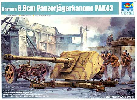 「ドイツ Pak43 8.8cm 対戦車砲 プラモデル (トランペッター 1/35 AFVシリーズ No.02308 )」です●「ドイツ Pak43 8.8cm 対戦車砲」を1/35スケールで再現したプラスチックモデル組立キット ●第2次世界大戦時、ほとんどの連合軍戦車を遠距離から撃破できる威力を誇ったドイツ軍の対戦車砲「88mm 対戦車砲 Pak43」を再現した内容となっています ●「Pak43 8.8cm 対戦車砲」の特徴である長大な砲身、大きな防盾、そして十字型砲架などが再現されており、実物の持つ迫力在る姿と、メカニカルな構造を楽しめる内容となっており、射撃状態と牽引状態とを選択して作製できます 【 「Pak43 88mm対戦車砲」について 】●ドイツ軍は、第2次世界大戦の勃発時には各国の対戦車砲とほぼ同クラスの「37mm 対戦車砲 Pak36」を装備していました ●この「37mm 対戦車砲 Pak36」は、フランス戦において火力不足が指摘されていましたが、後継兵器である「50mm 対戦車砲 Pak38」の生産が遅れ、そのままの状態で独ソ戦に突入、同砲は「T-34」などのソ連軍新鋭戦車にはまったくの無力さを露呈してしまいます ●ドイツ軍は、直ちに「50mm 対戦車砲 Pak38」の生産を急ぎ、次いで対戦車砲の本命である「75mm 対戦車砲 Pak40」の開発、生産が急ピッチで行なわれます ●この「75mm 対戦車砲 Pak40」は、通常の戦闘距離(2000m以内)において「T-34」を撃破できる高い威力を誇り、対戦車部隊の主力装備となりました ●一方、将来的にソ連軍の装甲が強化された戦車の出現が予想され、それに対抗できるより威力の高い砲の開発が進められます ●これにより生まれたのが「88mm 対戦車砲 Pak43」で、これは「88mm 高射砲 Flak41」を対戦車用に改良したもで、十字型砲架により全周への射撃が可能となっています ●この砲は、「75mm 対戦車砲 Pak40」を遥かに凌ぐ高い威力を発揮、4000mもの長距離において「T-34」を撃破できる能力を持っており、ドイツ軍の対戦車部隊の強力な兵器として活躍しました ●また、この砲は自走化され、「ナースホルン」などの対戦車車両の主砲となりました 【 「ドイツ Pak43 8.8cm 対戦車砲」のキット内容について 】●この「Pak43 8.8cm 対戦車砲」を再現 ●「Pak43 8.8cm 対戦車砲」の複雑な砲尾周囲、メカニカルな作りのトレーラー部など、細かなパーツ構成により詳細に再現されています ●88mm砲砲身は、プラパーツと金属製砲身との2種類の選択式となっています ・ プラパーツは、左右2分割式です ・ マズルブレーキは左右分割となっています ・ 砲身基部のスリーブ部は、金属製パーツです ・ 砲身部は上下方向に可動することが可能です ●砲尾の主要部は、4個のパーツで構成されています ・ 閉鎖器は、別パーツとなっており、開閉状態が選択できます ●「Pak43」の砲架部は、照準手席、昇降ハンドル、照準器などが細かく再現されています ・ 駐退器は、砲身の動きに合わせて動くように作製できます ●防盾部は、プラパーツとエッチングパーツとの選択式となっています ・ 砲身基部に存在する小防盾は、エッチングパーツが用意されています ●砲脚部は、左右の砲脚が可動式となっており、射撃時の展開状態と、牽引時の畳んだ状態とが選択できます ・ 砲脚の端に取り付けられる接地板は、射撃時及び牽引時の高さの違いが選択できるようになっています ・ トラベリングロックは、起倒が可動式となっており、ロック部分も可動します ●トレーラー部は、板バネ式サスペンションや、サスペンションアームなど細かなパーツ構成により、詳細に再現されています ●車輪は、ゴムの部分とホイール部分とが別パーツとなっています ・ ゴムの部分はラバー製のパーツです ●防盾部や砲弾の刻印部などを再現するエッチングパーツが付属しています ●「Pak43 8.8cm 対戦車砲」用のアクセサリーパーツが付属 ・ 砲弾 ×8 ・ 空薬莢 ×8(スライド式金型により先端部は開口処理されています) ●マーキングは、1種類の塗装例が説明書に記載されています ●2010年 完全新金型