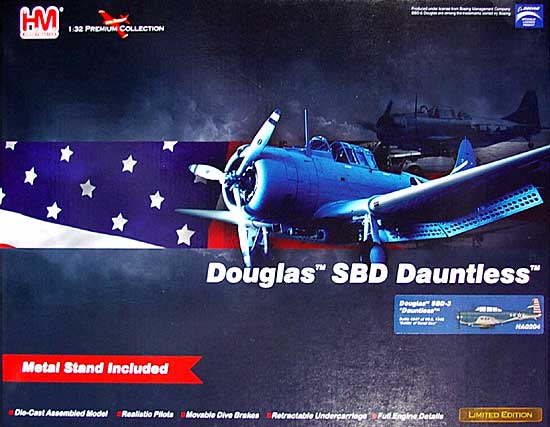 「SBD-3 ドーントレス 珊瑚海海戦スペシャル 完成品 (ホビーマスター 1/32 エアパワーシリーズ No.HA0204 )」です●「SBD-3 ドーントレス 珊瑚海海戦スペシャル」です●第2次大戦下のアメリカ海軍におてい運用されていた「SDB-3 ドーントレス」を1/32スケールで再現したダイキャスト製完成品モデル ●彩色済みの完成品モデルですので、パッケージから取り出して、そのままディスプレイすることができます (兵装類やパイロット、主脚の交換は機体にはめ込む形で取り付けて下さい) ●1942年の珊瑚海海戦に参戦したアメリカ海軍「第2偵察飛行隊」所属の「SDB-3 ドーントレス (S-12)」を再現した内容となっています ●機体全体には凹ラインでパネルラインが彫りこまれており、パネルラインに沿って薄くスミ入れが施されています ●機体上面はブルーグレー、機体下面はライトグレーの2色迷彩塗装を再現、尾翼の赤白のストライプや、ダイブブレーキ内側も塗り分けされています ・ 主翼の国籍マーク、識別番号などは印刷で再現されています ●「SDB-3 ドーントレス」が搭載していたエンジンディテールを再現 ・ 機首のカウルは塗装されたものと、クリアー仕様のものの2種が付属、クリアー仕様のカウルパーツを取り付けることで、エンジンディテールを隠すことなくディスプレイすることができます ●プロペラは回転させることが可能 ●主翼のダイブブレーキは開閉させることができます ●キャノピーはクリアパーツで再現、スライドさせて開閉状態を再現することができます ・ 複座型のコクピット内はシートなどが再現されています ・ 着座姿勢のパイロットフィギュア×2体が付属しています ●主脚は展開状態と収納状態を再現することが可能、主脚の引込みを行うことができます ●「SDB-3 ドーントレス」用の兵装パーツとして ・ 230kg 爆弾 ×1 ・ 45kg 爆弾 ×2 が付属、主翼下面に装備させることができます ●機体中央部に設置された爆弾懸架装置は可動させることができ、発射直前の230kg爆弾展開状態を再現することができます ●飛行姿勢で飾る事ができる「ダイキャスト製 ディスプレイスタンド」が付属 ●ダイキャスト製彩色済完成品モデル (一部プラスチックパーツを使用している箇所がございます) ●機体のサイズ ・ 全長 : 315mm ・ 全翼 : 400mm