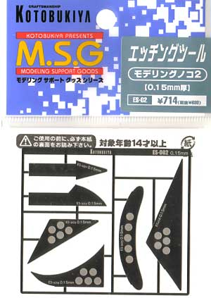 「モデリングノコ 2 (0.15ミリ厚) エッチングソー (コトブキヤ M.S.G エッチングツール No.ES-002B )」です●丈夫なステンレス製●ぎざぎざの角度が2種類、けがく深さや、素材の強度に合わせて使用する事ができます ●デザインナイフの柄にとりつけて使用するタイプと手に持って使用するタイプの2種 ●手に持って使用するタイプには、滑り止めとなるハーフホールつき ●エッチングノコ本体には、厚み(0.1ミリ・0.15ミリ)が刻まれているので、混同しても間違える心配がありません ●ステンレス製エッチング ●縦60ミリ×横69ミリ(エッチングパーツ全体)