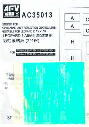 「レオパルト 2 A5/A6戦車用 反射防止コーティングレンズ表現用シール (2台分) シール (AFV CLUB 1/35 AC ディテールアップパーツ No.AC35013 )」です●「レオパルド 2 A5/A6戦車用 反射防止コーティングレンズ表現用シール (2台分)」です●1/35スケールの「レオパルド2A5」「レオパルド2A6」戦車に対応するペリスコープ用のクリアーフィルムです 【 「ペリスコープ部のコーティング」について】●戦車や装甲車両には、外部の様子を視察する装置としてペリスコープが装備されています ●このペリスコープは、潜望鏡方式となっており、たとえペリスコープが攻撃によって破壊されても、乗員に被害が及ばないようになっています ●ペリスコープには防弾ガラスが使用されていますが、そのままでは傷が付きやすく、また乱反射が発生するために、その表面上にはコーティングが施されています ・ このコーティングの施工には高い技術が必要で、その技術に乏しかった第2次世界大戦時のソ連は、戦車戦に苦戦し、イギリス製のペリスコープを輸入することになりました ●ペリスコープは、このコーティングの反射により独特な色彩を放つ特徴があり、その色は天候などの影響により変化します 【 「反射防止コーティングレンズ表現用シール レオパルド 2 A5/A6戦車用」の製品内容について】●このコーティングが施されたペリスコープのガラス面を再現する彩色済のクリアーフィルムです ●塗装では再現が難しいペリスコープを再現、キットのペリスコープの開口部に合わせて切り込みが入っており、キットパーツに貼るだけ で、その独特のガラス部分を再現することができます ●キットの各ペリスコープ、車長用視察サイト、砲手用の照準サイトなどのガラス部が用意されています ●フィルムには、薄い青色に着色されており、角度によって濃い青色から薄い緑色に変化する特殊な表面処理が施されています ●シートには2台分のペリスコープ用フィルムが含まれています 【 「反射防止コーティングレンズ表現用シール レオパルド 2 A5/A6戦車用」の対応キット 】・ タミヤ製「ドイツ連邦主力戦車 レオパルド2 A6」 ・ タミヤ製「ドイツ連邦主力戦車 レオパルド2A5」 ●パッケージ内容 ・ 彩色済みクリアーフィルム ×1枚 (2台分)