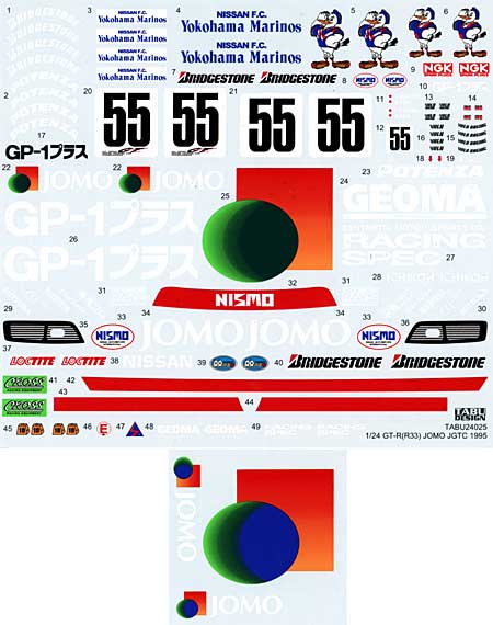 「ニッサン スカイライン GT-R (R33) JOMO JGTC 1995 デカール (タブデザイン 1/24 デカール No.TABU-24025 )」です●タミヤ製「ユニシアジェック スカイライン (ニスモGT-R)」などの「スカイライン GT-R (R33)」型のレースマシンに対応したデカールセット 【 「ニッサン スカイライン GT-R (R33) JOMO JGTC 1995」の製品内容について 】●1995年に開催された「JGTC 全日本GT選手権」の「GT1クラス」に「NISMO」より第3戦から参戦した「JOMO スカイライン GT-R (R33)」の車体マーキングを再現することが可能なデカールセット ●「JOMO スカイライン (R33)」は、この年の開幕戦から唯一「R33」をエントリー、ドライバー鈴木利男(第2戦まで飯田章と共)の下、全戦に渡りポイントを獲得、シリーズ総合3位を獲得しています ●この1995年の「JOMO スカイライン GT-R (R33)」の車体を飾った ・ 「JOMO」「JOMO NISSAN」のメインスポンサーロゴ・マークを始め、「BRIDGESTONE」「POTENZA」「GEOMA」「RACING SPEC」「NISMO」「NGK」「Yokohama Marinos」などのスポンサーロゴ・マーク類 ・ ボディサイドに大きく描かれた「GP-1プラス」や「マリノス君」のイラスト ・ 「POTENZA」「BRIDESTONE」のタイヤマーク、「VOLK RACING」「MRC」のホイールロゴ ・ 「NISMO」ロゴの入ったフロントウインドスクリーン ・ アンダートレーの塗り分け用レッドライン ・ ゼッケンナンバー ・ 国籍マーク付きのドライバーネーム ・ ウェイト表示マーク ・ JGTC参戦車両マーク などがデカールで再現されています ●対応するゼッケンナンバーは No.55 鈴木利男・飯田章 【 「ニッサン スカイライン GT-R (R33) JOMO JGTC 1995」のパッケージ内容について 】●デカールシート : 2枚入 ・ デカールは高品質なシルクスクリーンデカールです ●「ユニシアジェック スカイライン (ニスモGT-R)」など「GT-R (R33)」のキットは別売りとなります
