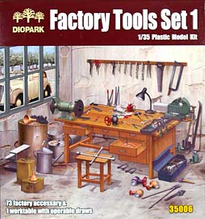 「工場ツールセット 1 プラモデル (ダイオパーク 1/35 プラスチックモデルキット No.35006 )」です●整備工場や、作業部屋などにおける「作業机」「整備道具」「工具類」を1/35スケールで再現したアクセサリーキット 【 「工場ツールセット 1」のキット内容について 】●木製の作業机と、そこに設置された工具類、そして整備用の道具、工具などをシャープに再現、第2次世界大戦時の整備工場や、現在の個人の作業部屋の再現まで広く活用することができる内容となっています ●また、戦車などの整備に欠かせない細かな工具類がセットされていますので、整備のシーンの再現に役立つことでしょう ●キットパーツは全てプラスチック製で、細かな造形によりハサミやラジオペンチなどの小さな工具の相違もしっかりと判別が可能です ●キットに含まれているパーツ内容 ・ 作業机 ×1 ・ 椅子 ×1 ・ 万力 ×1 ・ グラインダー ×1 ・ ジャッキ2種 ×各1 ・ 卓上ランプ ×1 ・ じょうご2種 ×各1 ・ 卓上固定クランプ ×2 ・ ツールボックス ×1 ・ じょうろ ×1 ・ ワイヤーカッター2種 ×各1 ・ 十字レンチ ×1 ・ ドライバー ×4 ・ 釘抜き ×1 ・ オイル挿し ×1 ・ 大型レンチ2種 ×各1 ・ スパナ ×5 ・ 6角レンチ ×5 ・ ノコギリ ×1 ・ コンパス ×1 ・ 金属ノコギリ ×1 ・ 刷毛 ×1 ・ モンキーレンチ ×2 ・ 棒ヤスリ ×2 ・ シャベル ×1 ・ ハンマー(大、小) ×各1 ・ ペンチ ×2 ・ ハサミ ×2 ・ ラジオペンチ ×2 ・ 金切りハサミ ×2 ・ ウォータープライヤー ×2 ・ ブリキ缶 ×2 など ●パッケージの裏側には、1/35のスケールで使用するソ連戦車「KV-2」のペーパークラフト模型(1/350スケール程度)が印刷されています ●2011年 完全新金型