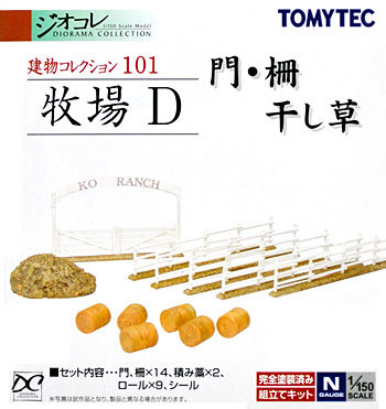 「牧場 D (門・柵・干草) プラモデル (トミーテック 建物コレクション (ジオコレ) No.101 )」です●1/150スケールの「Nゲージ」サイズで展開する「建物コレクション」、昭和から現代までの風景に見られる牧場のアクセサリー類を1/150のスケールで再現した「牧場 D (門、柵、干草、積み藁)」です ●細部の造作や質感までも再現された壁や屋根、塀や小物などを、ジオラマベースに差し込んでいくだけで簡単に組立てる事ができる接着剤不要の組立キット ●パーツ類は既に塗装済となっておりますので、組立てるだけで1/150スケールのストラクチャーが完成します ●1/150スケールですので、Nゲージだけでなく、他のコレクションにも転用する事ができます 【 「牧場 D (門、柵、干草、積み藁)」のキット内容について 】●「牧場 D (門、柵、干草、積み藁)」は、牧場のアクセサリーとなる門、柵、干草、積み藁を1/150のスケールで再現 ●キットには、「門」(×1)、「柵」(×14)、「積み藁」(×2)、藁のロール(×9)がセットされています ●「門」は、木造の両開き式タイプで、上部には牧場の名前が掲げられたアーチが付けられています ●「柵」は、家畜の通行を妨げる程度の簡単な造りとなっています ●各アクセサリーには雰囲気を再現するために、パーツにウェザリング処理を施しています ●「牧場 D (門、柵、干草、積み藁)」は牧場用のアクセサリーですので、トミーテック社製「牧場シリーズ」(「牧場 A (母屋)」、「牧場 B (牛舎)」、「牧場 C (サイロ・羊小屋・風車)」)の演出に適した内容となっています ●また、同社製「ザ・動物」シリーズの「牛 (B) 乳牛 003」、「羊・やぎ 005」、 「ザ・人間」シリーズの「牧場の人々 066」「牧場の人々 067」などと合わせて使用すると、牧場の雰囲気がより向上することでしょう ●レイアウト概寸(柵) : 幅約6cm × 奥行き約0.5cm ×高さ約1cm 【 「牧場 D (門、柵、干草、積み藁)」のパッケージ内容 】・ 門 ×1 ・ 柵 ×14 ・ 積み藁 ×2 ・ ロール ×9 ・ シール ●製品素材 ・ 本体・パーツ : ABS、PVC(非フタル酸系可塑剤を使用しています) 【 「ジオコレ 建物コレクション」について 】●昭和から現代に至るまで、都市や郊外など様々な場所で見かけたことのある「建物」を1/150スケールで再現したシリーズが「ジオコレ 建物コレクション」、人が住む住宅から小型~大型の商業施設、学校や神社仏閣などの公共施設まで、街を構成する幅広いジャンルの建物を再現しています ●パーツは塗装済み、部分的にウェザリングも施され、はめ込むだけで簡単に組立てることができるので、誰でも「建物」の完成品を楽しむことができます ●建物が持つ特徴的な細部の造作や、質感も再現された壁や屋根、塀や小物などをベースと組み合わせて1/150スケールながら実感ある建物を再現することができる内容となっています ●また建物単体だけでなく、トミーテック社の情景コレクション「情景小物」「ザ・人間」「ザ・動物」や「カーコレクション」「トラックコレクション」「バスコレクション」などと組み合わせて、情景世界を広げることができるのも魅力となっています