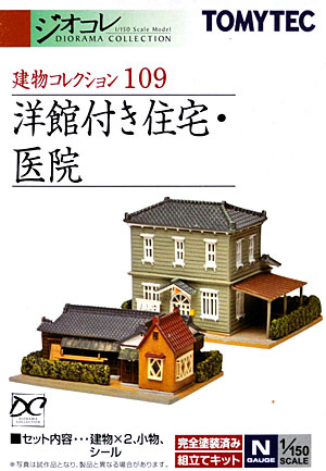 「洋館付き住宅・医院 プラモデル (トミーテック 建物コレクション (ジオコレ) No.109 )」です●「洋館付き住宅・医院」です●1/150スケールの「Nゲージ」サイズで展開する「建物コレクション(ジオコレ)」、昭和のレトロなイメージを持つ住宅を再現した「洋館付き住宅・医院」です ●瓦葺の屋根に建築年数が経った色合い、生垣などのアクセサリーパーツもセットされ、昭和の街並みの雰囲気を演出してくれます ●細部の造作や質感までも再現された壁や屋根、小物などを、ジオラマベースに差し込んでいくだけで簡単に組立てる事ができる接着剤不要の組立キット ●パーツ類は既に塗装済となっておりますので、組立てるだけで1/150スケールのストラクチャーが完成します ●1/150スケールですので、Nゲージだけでなく、他のコレクションにも転用する事ができます 【 「洋館付き住宅・医院」のキット内容について 】●「洋館付き住宅・医院」は昭和レトロの雰囲気を持つ「洋館付き住宅」と「医院」を1/150のスケールで再現 ●建物は、昭和以前のレトロな雰囲気を持つ建物を再現、「洋館付き住宅」は小さな洋館を併設した住宅、「医院」は洋風と和風の特徴を持った個人医院となっています ●建物の構造は、「洋館付き住宅」は木造瓦葺平屋建て、「医院」は木造瓦葺2階建てとなっています ●各建物には、周囲に生垣が設けられています ●「洋館付き住宅」は、玄関先に小さな「洋館」、木造の扉、サッシが使われています ・ このような木造のサッシは昭和30年代まで見られましたが、その後は急激に金属製サッシへと変更されて行きました ・ 縁側部分には「よしず」が立て掛けられ、庭の部分には木製の物干しが設置されています ●「医院」は、側面に庇が設置、壁の部分は「洋館」式に板貼りで、窓部分も「洋館」式となっています ・ 入り口の横には医院の内容を表示する看板が立てられています ・ 屋根部分は、日本瓦葺きですので、明治から昭和初期に見られた「洋館」造りの日本建築です ・ このような建物は、現在では希少となりましたが、同様な造りで新たに建てられる場合もあります ●建物の雰囲気を再現するために、パーツにウェザリング処理を施しています ●レイアウト概寸 ・ 洋館付き住宅 : W9cm × D6cm × H4cm ・ 医院 : W9cm × D6cm × H6cm 【 「洋館付き住宅・医院」のパッケージ内容 】・ 建物 × 2 ・ 小物 (アクセサリー) ・ シール ●製品素材 ・ 本体・パーツ : ABS、PS、PVC 【 「ジオコレ 建物コレクション」について 】●昭和から現代に至るまで、都市や郊外など様々な場所で見かけたことのある「建物」を1/150スケールで再現したシリーズが「ジオコレ 建物コレクション」、人が住む住宅から小型~大型の商業施設、学校や神社仏閣などの公共施設まで、街を構成する幅広いジャンルの建物を再現しています ●パーツは塗装済み、部分的にウェザリングも施され、はめ込むだけで簡単に組立てることができるので、誰でも「建物」の完成品を楽しむことができます ●建物が持つ特徴的な細部の造作や、質感も再現された壁や屋根、塀や小物などをベースと組み合わせて1/150スケールながら実感ある建物を再現することができる内容となっています ●また建物単体だけでなく、トミーテック社の情景コレクション「情景小物」「ザ・人間」「ザ・動物」や「カーコレクション」「トラックコレクション」「バスコレクション」などと組み合わせて、情景世界を広げることができるのも魅力となっています