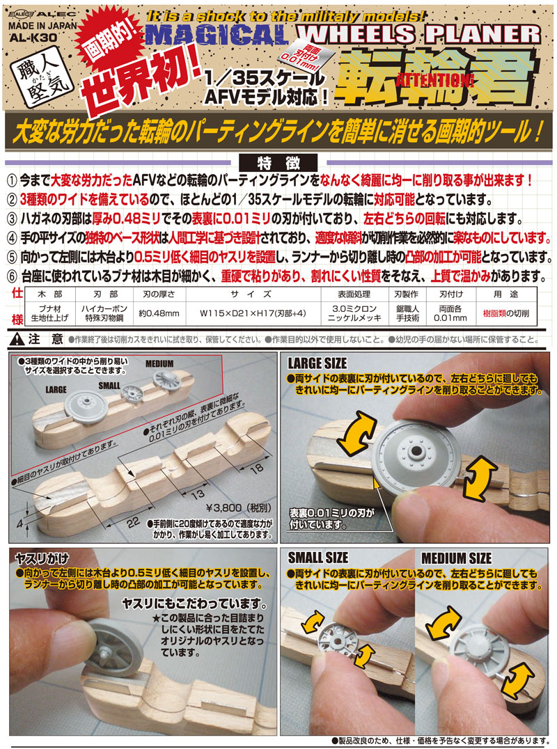 ●今まで大変な労力だった、AFVなどの転輪のパーティングラインや接合面などをなんなく均一に削り取ることができる画期的ツールです ●3種類のワイドを備えているのでほとんどの1/35スケールの転輪に対応しています