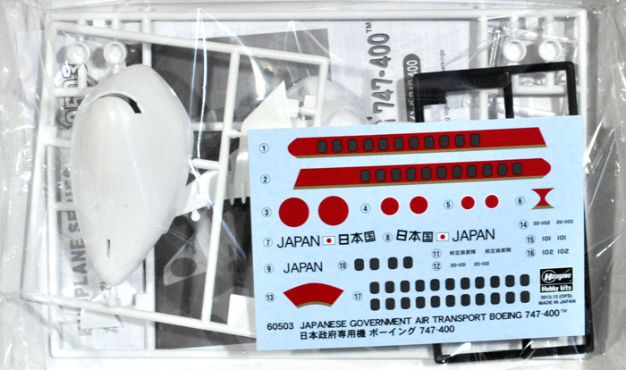 「日本政府専用機 ボーイング 747-400 プラモデル (ハセガワ たまごひこーき シリーズ No.60503 )」です●「日本政府専用機 ボーイング 747-400」をノンスケールで再現したプラスチックモデル組み立てキット ●かわいらしいタマゴ型のシルエットでデフォルメした「ボーイング 747-400」の日本国政府専用機を再現 ●簡単に組立て、気楽に楽しくプラモデルを楽しむことができる内容となっています 【 「日本政府専用機 ボーイング 747-400」のキット内容について 】●「ボーイング 747-400」の機体は機体胴体を上下分割のパーツで構成、主翼下のエンジンナセル、水平・垂直尾翼、ランディングギア部は別パーツ化されています ・ 主翼は機体下部のパーツと一体成型されており、翼端のウイングレットも再現されています ・ エアライナーらしいかわいらしさが演出できるよう、機体表面にはパネルラインなどの凹モールドは掘り込まれていません ・ 主翼、尾翼のフラップ類部分には凹モールドで区切りがつけられています ・ エンジンナセルの内側にはブレードが細かな彫刻で再現されています ●コクピットシールドは別パーツ化され、シールド部分はクリアパーツで再現してます ・ シールド上の窓枠はクリアパーツ上に凸モールドで再現されています ●ランディングギアはそれぞれ独立したブロックで構成 ・ 脚柱と片側のタイヤが一体成型のパーツになっており、並列するタイヤは別パーツ化して再現されています ・ 主脚部は展開した駐機状態のみを再現することができます ![]() 【 「日本政府専用機 ボーイング 747-400」の塗装とマーキング 】 ●説明書内には ・ ボーイング 747-400 日本国政府専用機 (20-1101) ・ ボーイング 747-400 日本国政府専用機 (20-1102) のマーキング例が記載されており、いずれか1種を再現することが可能です ●「日本国」「JAPAN」「航空自衛隊」のロゴ、日の丸、機体機体胴体中央を走るレッド×ゴールドのライン、窓を再現したデカールが付属 ・ 胴体中央のラインを塗装で再現した時のため、窓部分のみを再現したデカールもセットされています ●パーツ成型色 ・ 胴体、翼など : ホワイト ・ 脚 : ブラック ●組立には接着剤が必要となります 【 「日本政府専用機 ボーイング 747-400」のパッケージ内容 】・ 日本政府専用機 ボーイング 747-400 ×1 ・ デカールシート ×1 ●スポット生産品