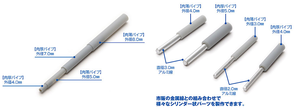 ●また、パイプの厚みについては「肉薄」「肉厚」の2種のタイプを用意していますので、製作したい部品に合わせて選択して下さい。