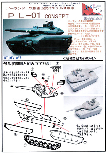 「PL-01 コンセプト レジン (マツオカステン 1/144 オリジナルレジンキャストキット (AFV) No.MTUAFV-068 )」です●「PL-01 コンセプト」です●ポーランド軍の次期主力試作ステルス戦車「PL-01」のコンセプト車両を1/144スケールで再現したレジン製組立てキット ●従来の戦車とは一線を隔し、ステルス性能を重視した「PL-01」を再現、突起物を極力減らし、砲身部分までカバーが付けられた、のっぺりとした独特のスタイルを表現した内容となっています 【 「PL-01」について 】●「PL-01」は、ポーランドの機械設備開発研究センター「OBRUM」とイギリスの大手防衛軍事産業メーカー「BSEシステムズ」との共同によって開発されたステルス機能を重視した次世代戦車です ●車体は、スウェーデン製の歩兵戦闘車「CV90」をベースとして自動装填装置付きの105mm戦車砲を搭載、車体と砲塔にはステルス性を重視して突起物を極力減らしたモジュラー装甲を装備し、その起伏のない姿は航空機のステルス機、艦艇のステルス艦を彷彿させます ●また、副武装として砲塔上部にはリモコン式の機銃を装備、その砲塔の両脇には多数の穴が開けられ、発煙弾もしくは擲弾を発射できるようになっています ●「PL-01」は、今後120mm砲を搭載することを予定、ポーランド軍では2018年頃から生産ラインを確立し、2022年までに制式化する計画が立てられています 【 「PL-01 コンセプト」のキット内容について 】●このポーランド軍の次期主力試作ステルス戦車「PL-01」のコンセプト車両を再現したレジン製組立てキットです ●「PL-01」の特徴的なフォルムを捉えながら、レジン成型の特性を活かし、パーツ数を抑えてそのディテールをスケールに沿ってシャープかつ詳細に再現した内容となっています ●「PL-01」は、「砲塔」「車体」、左右の「足周り」の4ブロックで構成されています ●「砲塔」は砲身を含めた一体成型で、これに照準サイト、リモコン機銃などを取り付ける構成となっています ・ 砲塔前部のステルスパターン、照準口、砲塔後部の多数の穴などが彫刻されています ・ 砲塔前後の正方形のパネルも彫刻にて再現 ・ 機銃は、弾薬箱、銃架も含まれた一体成型となっています ●「車体」は、フェンダーも含めて一体成型されており、サイドのモジュラー装甲部は別パーツです ・ 操縦手ハッチ、前部グリル、後部グリル、後部ハッチなどのディテールが繊細にモールドされています ●「足周り」は、車体側面パネル、転輪、履帯が一体成型されています ・ 履帯表面のパターン、転輪のホイール形状などが細かく彫刻されています ●「PL-01」のコンセプト車両のマーキングを再現したデカールが付属しています 【 「PL-01 コンセプト」のパッケージ内容 】・ PL-01 コンセプト車両 ×1 ・ デカールシート ×1枚 ------------------------------------------------------- 【 「PL-01 コンセプト」の組立て上のご注意 】●レジン製キットですので、組立てる前にファインモールド社製「ご機嫌クリーナー 」などを使用して表面に付着している離型剤を洗い流して下さい ●また、パーツの接着には、瞬間接着剤もしくはエポキシ系瞬間接着剤を使用して下さい ●付属しているデカールはエナメル系溶剤に弱い素材となっていますので、デカール面にエナメル溶剤を使用したウォッシングなどは行わないようにしてください