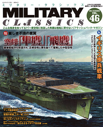 「ミリタリー・クラシックス Vol.46 雑誌 (イカロス出版 ミリタリー クラシックス (MILITARY CLASSICS) No.046 )」です(2014年7月19日発売)【 巻頭特集 】 麗しき不撓の鷹翼 空母「隼鷹」「飛鷹」●太平洋戦争開戦前、仮想敵国であるアメリカ、イギリスよりも帝国海軍の海軍力は劣っていたため、有事の際には軍用船として転用されることを前提に、商船の建造費へ助成制度を設けました ●商船会社は、この制度を利用することで建造費を大幅に圧縮することができるという利点があり、帝国海軍の要望から通常の商船より高速性を誇る大型商船が続々と建造されます ●これらの商船は、太平洋戦争が開戦すると様々な艦へと転用、主に補助戦力として活用されましたが、帝国海軍が最も期待していたのが航空母艦に転用された船でした ●しかし、実際に転用された商船改造空母は艦載機用のカタパルト装備が実現しなかったことから、小型過ぎて実戦運用するのが難しく、さらに商船としては高速でも航空母艦としては低速であり、実際には航空機輸送や若干の船団護衛任務に活躍するに留まりました ●ところが、この商船改造空母の中で、異彩を放ち、中型空母に匹敵する活躍を見せたのが「隼鷹」「飛鷹」の2隻です ●この「隼鷹」「飛鷹」の元となった「橿原丸」「出雲丸」は24,000tクラスの超大型客船として起工、その建造途中で航空母艦に改装されたため、煙突を艦橋と一体化させた島型艦橋を持ち、中型空母に相当する搭載機数を誇る空母として竣工しました ●「隼鷹」「飛鷹」は、ミッドウェー海戦で正規空母4隻が戦没したことから空母機動部隊の主力を占めるようになり、南太平洋海戦やマリアナ沖海戦などの大きな海戦で正規空母と肩を並べて奮戦しています ●今号の「ミリタリー・クラシックス」では、この航空母艦「隼鷹」「飛鷹」を特集、数奇な運命をたどったこの両艦の各部メカニズム、建造の経緯、戦闘記録などを多角的に分析します ●商船改造空母は非力で運用が難しいという評価を覆す活躍を見せた「隼鷹」「飛鷹」、改造空母ながら近代的な艦橋を備え、空母機動部隊の一翼を担ったその姿に迫ります 【 第2特集 】歩兵の守護神となった英国の重装騎兵 イギリス歩兵戦車●第2次世界大戦前から大戦時にかけて、イギリス軍は戦車を低速ながらも重装甲で歩兵の支援に従事する「歩兵戦車」と、高い機動性能を備えて追撃や戦線突破に使用する「巡航戦車」という2つのカテゴリーに分類して開発を行いました ●「歩兵戦車」としては、「マチルダ 1」「マチルダ 2」「バレンタイン」「チャーチル」という4種の車両が戦線に投入されています ●この「歩兵戦車」と「巡航戦車」というカテゴリー分けは、汎用性の高い戦車を開発できなかったことで、現代では批判の的となっていますが、「歩兵戦車」は分厚い装甲により枢軸国軍を苦しめ、北アフリカ戦線初期に投入された「マチルダ 2」は「戦場の女王」とも呼ばれる存在でした ●「バレンタイン」は歩兵戦車としては若干凡庸な性能でしたが、同車が供与されたソ連軍では「バレンタイン」を高く評価、その要望からイギリス軍では運用が停止された後もソ連軍向けに生産が続けられています ●「チャーチル」は分厚い装甲により、ドイツ軍にとって難敵となり、そのキャパシティの大きさから工兵用や特殊車両としても用いられ、頼りになる存在となっています ●第2特集では、このイギリス軍の「歩兵戦車」を特集、強力なドイツ戦車や「シャーマン ファイアフライ」のようなアメリカ製戦車の存在により若干影が薄いのも事実ですが、イギリスを象徴するかのようなフォルムを持った歩兵戦車はとても魅力的です ●時には歩兵の盾となってその身を呈して活躍したイギリス軍の歩兵戦車、その真の姿を紹介します 【 「ミリタリー・クラシックス Vol.46」の内容目次 】■空母「隼鷹」「飛鷹」 ●隼鷹型空母 名シーンセレクション ・ ダッチハーバー空襲 ・ 南太平洋海戦 ・ マリアナ沖海戦 ●これが俺たちが夢見た南太平洋海戦だ! ●空母「隼鷹」「飛鷹」実戦塗装図集 ●隼鷹型航空母艦のメカニズム ●日本海軍の改装空母整備計画 ●隼鷹型空母の建造と空母改装の経緯 ●隼鷹型空母の運用と艦隊編制 ●空母「隼鷹」「飛鷹」艦上機名鑑 ●太平洋の荒鷹 隼鷹型空母の戦歴 ●隼鷹型2隻の艦歴 ●隼鷹型空母関連人物列伝 ●隼鷹型空母の副長になってみよう! ●まけた側の良兵器集 「隼鷹」編 ●南太平洋の凱歌 隼鷹型空母架空戦記 ●隼鷹型以外の客船・商船改装空母 ■イギリス歩兵戦車 ●イギリス歩兵戦車実戦塗装図集 ●イギリス歩兵戦車発達史 ●イギリス歩兵戦車の部隊編制と運用 ●イギリス歩兵戦車 各車解説 ・ 歩兵戦車Mk.1(A11)マチルダ ・ 歩兵戦車Mk.2(A12)マチルダ ・ 歩兵戦車Mk.3バレンタイン ・ 歩兵戦車Mk.4(A22)チャーチル ●イギリス歩兵戦車の戦闘記録 ●イギリス歩兵戦車関連人物列伝 ■ 連 載 ●ねいばるインスティテュート ●帝国