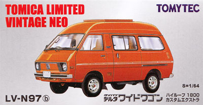 「ダイハツ デルタ ワイドワゴン ハイルーフ 1800 カスタムエクストラ (ゴールド) ミニカー (トミーテック トミカリミテッド ヴィンテージ ネオ No.LV-N097b )」です●「ダイハツ デルタ ワイドワゴン ハイルーフ 1800 カスタムエクストラ (ゴールド)」を1/64スケールで再現したミニカー ●タウンエースのOEM車、ダイハツ・デルタワイドを乗用ワゴン仕様で製品化 ●タウンエースとの最大の違いであるフロントグリル部分はパーツを変更して差別化 ●ルーフにはサンルーフ部品(開閉はしません)を別途装着、1970年代末に流行した乗用ワンボックスカー時代を偲びます