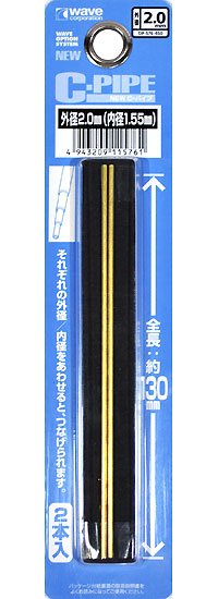 「NEW C・パイプ 2.0 金属材 (ウェーブ C・パイプ No.OP-576 )」です●カット加工や整形処理を行いやすい汎用性の高い真鍮製パイプ2本セット ●外径 : 2.0mm ●内径 : 1.55mm ●長さ : 130mm 【 「NEW C・パイプ」について 】●「NEW C・パイプ」シリーズは、径の異なる様々なサイズをラインナップに揃え、色々なサイズに対応したり、組み合わせができる汎用性の高い金属製素材となっています ●「NEW C・パイプ」は、プラモデルの改造、ディテールアップ、スクラッチ用の素材として使用するほか、建築模型や鉄道模型、ドールハウス、クラフト工作など各種模型の製作、工作用資材などに幅広く使用することが可能です ●「NEW C・パイプ」は真鍮製のパイプ状素材、真鍮製ですので高い強度を持ち、熱や水にも強いのが特徴です ・ 金属製のメリットを活かして、補強材としても利用できます 【 「NEW C・パイプ 2.0」の製品内容について 】●「NEW C・パイプ」は適度な強度と加工性を備えた真鍮製のパイプ素材、ディテールアップやプラパーツの強度確保など様々な用途に使用することができます ●航空機モデルの機銃(機関砲)表現、スケール・キャラクターモデルなどのサスペンションや小バーニアなどの再現、パイプの形を利用した○モールドの復活など模型製作の際に広く利用することができます ●ウェーブの「NEW C・パイプ」シリーズは、外径と内径のサイズを合わせると連続して接続することができるサイズでラインナップされています 【 内径に合わせて差し込む 】 ・ 「NEW C・パイプ 2.0」の内径部分には、「NEW C・パイプ 1.5」を差し込むことができます ・ 「NEW C・パイプ 2.0」の内径と「NEW C・パイプ 1.5」の外径とは0.05mmという最小サイズの差で、最小限の隙間を確保しながらもカッチリと差し込むことができます ・ また、同様に1.5mm径のプラ棒、金属棒などを差し込むこともできます 【 外径に合わせて差し込む 】 ・ 「NEW C・パイプ 2.0」は「NEW C・パイプ 2.5」の内径へと差し込むことができます ・ 「NEW C・パイプ 2.0」の外径と「NEW C・パイプ 2.5」の内径とは0.05mmという最小サイズの差で、最小限の隙間を確保しながらもカッチリと差し込むことができます ・ また、同様に内径2.0mmのプラパイプなどに差し込むこともできます 【 「NEW C・パイプ 2.0」の加工について 】●「NEW C・パイプ」は真鍮製ですので加工しやすいのですが、ペンチなどで切断すると径を大きく歪めてしまいます ●同パイプをカットする場合には、カッターナイフの刃を直角に当て、平な場所で真っ直ぐに転がすことで切り離す事ができます ・ パイプ内側に1.5mm径の真鍮線などを差し込んでからカット作業を行うと、歪みを防止することができます ・ カット時には、パイプの先端部が衝撃により飛ぶこともありますから、その防止として軽く手を添えるなどの対策をお勧めします ●「NEW C・パイプ」は基本的に直線状の状態で使用して下さい、緩い角度には曲がりますが、深く曲げると変形してしまいます ●塗装の際は、事前にGSIクレオス社製「Mr.メタルプライマー」などの金属用プライマーを塗り、その後に模型用塗料を使用して下さい ![]() 【 「NEW C・パイプ 2.0」の製品仕様 】●サイズ : 外径 2.0mm × 内径 1.55mm ●全長 : 130mm ●製品素材 : 真鍮 ●2本入り ●ご利用の前にはパッケージ台紙裏側の取扱説明書をよくお読み頂いた上でご使用下さい