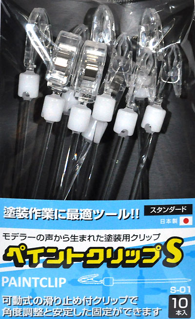 「ペイントクリップ S (10本入) 塗装持ち手 (マーゼンプロダクツ ペイントクリップ No.S-01 )」です●塗装作業時、パーツ類をクリップで挟んで固定し、軸の部分を「持ち手」とすることができる塗装補助ツールです ●軸の部分が長めの設計となっていますので、GSIクレオス社製「Mr.ペイントステーション」、ホビーベース製「大きな塗装ベース」 、HIQパーツ社製「ペインティングベース」などを利用して差込み、乾燥させることができます 【 「ペイントクリップS (10本入)」の製品内容について 】●模型の塗装作業時、細かなパーツを塗装する際には、パーツ本体が小さく余白がないため塗装作業に困る時があります ●ついパーツを手で持って塗装を行うということをしてしまいがちですが、その大部分が塗装されているために、塗料の乾燥までどこに置くべきかと迷ったり、手で触ってしまって塗装面が汚れてしまう例も少なくありません ●そこで役立つのが、塗装用のクリップです ●この「ペイントクリップS (10本入)」は、クリップのメーカーが作製した「塗装用持ち手クリップ」で、クリップが対象物をしっかりホールドするので塗装作業がスムーズに進められます ●クリップ先端の最大開口長は約6mm、少し大きめのパーツや余白部分が薄めのパーツの保持に適しています ●クリップ部分の下部にはポールジョイントが設けられ、角度の調整が可能です ・ 自在に角度を調整できるので塗装スペースを有効活用できます ●クリップ内側は軟質素材でフラットな形状なので対象物を痛めにくいようになっています ●軸は長めとなっていますから、先端部を「発泡スチロール」「粘土」などに差し込んで使用することができます ・ 先端部は突き刺し易い尖った形状となっています ・ GSIクレオス社製「Mr.ペイントステーション」、ホビーベース製「大きな塗装ベース」 、HIQパーツ社製「ペインティングベース」などを利用しても良いでしょう 【 「ペイントクリップS (10本入)」のサイズ 】・ 全長 : 約135mm (クリップ含む) / 1本あたり ・ クリップ部の長さ : 約25mm / 1本あたり ・ クリップの幅 : 約10mm / 1本あたり ・ 軸の太さ : 約3.5mm / 1本あたり 【 「ペイントクリップS (10本入)」の製品素材 】・ クリップ部 : PS ・ 軸 : PC ・ バネ : ステンレス ・ マット : エラストマー ・ ジョイント : POM 【 「ペイントクリップS (10本入)」のパッケージ内容 】・ ペイントクリップS ×10 【 「ペイントクリップ」の種類について 】●「ペイントクリップ」はクリップの大きさやベースの有無などにより、「ペイントクリップ (プチスリム)」「ペイントクリップ S」「ペイントクリップ (プチワイド)」「ペイントクリップ (プチスリム 連結ベース付)」「ペイントクリップ (プチワイド 連結ベース付)」の5種がラインナップ ●パーツの大きさに応じたグリップのしやすさ、塗装の際の取り回しをしやすくするため、大きめのパーツには「ペイントクリップ S」を、極小パーツには「ペイントクリップ (プチスリム)」を、といった具合にパーツの大きさに応じて使い分けるのがよいでしょう