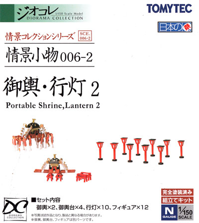「御輿・行灯 2 プラモデル (トミーテック 情景コレクション 情景小物シリーズ No.006-2 )」です●1/150スケールの「Nゲージ」サイズで展開する「情景コレクション」、神社に設置している行灯と、祭りの中心になる御輿を1/150スケールで再現した「御輿・行灯 2」です ●トミーテック社製「006 御輿・行灯」のリニューアル版となります ●「建物コレクション」や「情景コレクション」などと共に、1/150スケールのNゲージサイズの建物・構造物として活用する事ができる接着剤不要の組立キットが「情景コレクションシリーズ」です ●私たちが生活する街の中で見かける風景を再現するため、建物を始めとした多種多様な街の構成要素を手軽に再現する事ができます ・ パーツ類は既に塗装済となっていますので、組立てるだけで1/150スケールのストラクチャーが完成します ●1/150スケールですので、Nゲージだけでなく、他のコレクションにも転用する事ができます 【 「御輿・行灯 2」のキット内容について 】●「御輿・行灯 2」は、神社に設置された「行灯」と、祭りの中心になる「御輿」を1/150スケールで再現 ●本パッケージでは ・ 御輿 ×2 ・ 御輿台 ×4 ・ 行灯 ×10 ・ フィギュア ×12 をセットしています ●フィギュアは、御輿を担ぐ「法被」姿の人々を再現しており、1つの御輿を担ぐ人数分となります ・ 法被姿の人と御輿は別パーツとなっており、御輿を担ぐシーンの再現には組立てが必要となります ・ 組立てにはゴム系接着剤などをご利用下さい ●建物の雰囲気を再現するために、パーツにウェザリング処理を施しています ●レイアウト概寸 ・ 御輿とフィギュアの組立て時 : 幅1 × 奥行き3 × 高さ2 (cm) 【 「御輿・行灯 2」のパッケージ内容 】・ 御輿 ×2 ・ 御輿台 ×4 ・ 行灯 ×10 ・ フィギュア ×12 ●製品素材 ・ 本体 : ABS、PVC(非フタル酸系可塑剤を使用しています) -------------------------------------------------------------- 【 「ジオコレ 情景小物シリーズ」について 】●昭和から現代に至るまで、都市や郊外など様々な場所で見かけたことのある「造作物」を1/150スケールで再現したシリーズが「ジオコレ 情景小物コレクション」、私たちが生活する街の中で見かける風景を再現するため、多種多様な街の構成要素を手軽に再現する事ができます ・ 線路周りの「踏切」や「柵」、街並みに必須の「電柱」、公園の「遊具」にお祭りの情景、さらに海にまつわる「漁船」や「消波ブロック」など、建物の存在を引き立て情景シーンにリアルさを加えてくれる造作物を再現しています ●パーツは塗装済み、部分的にウェザリングも施され、はめ込むだけで簡単に組立てることができるので、誰でも街の造作物の完成品を楽しむことができます ●対象となった造作物が持つ特徴的な形状、質感なども再現するだけでなく、情景に合わせたシール類も付属し、「建物コレクション」などと組み合わせて1/150スケールながら実感ある町並み再現することができる内容となっています ●トミーテック社の 「建物コレクション」や情景コレクション「ザ・人間」「ザ・動物」、「カーコレクション」「トラックコレクション」「バスコレクション」などと組み合わせて、情景世界を広げることができるのも魅力となっています
