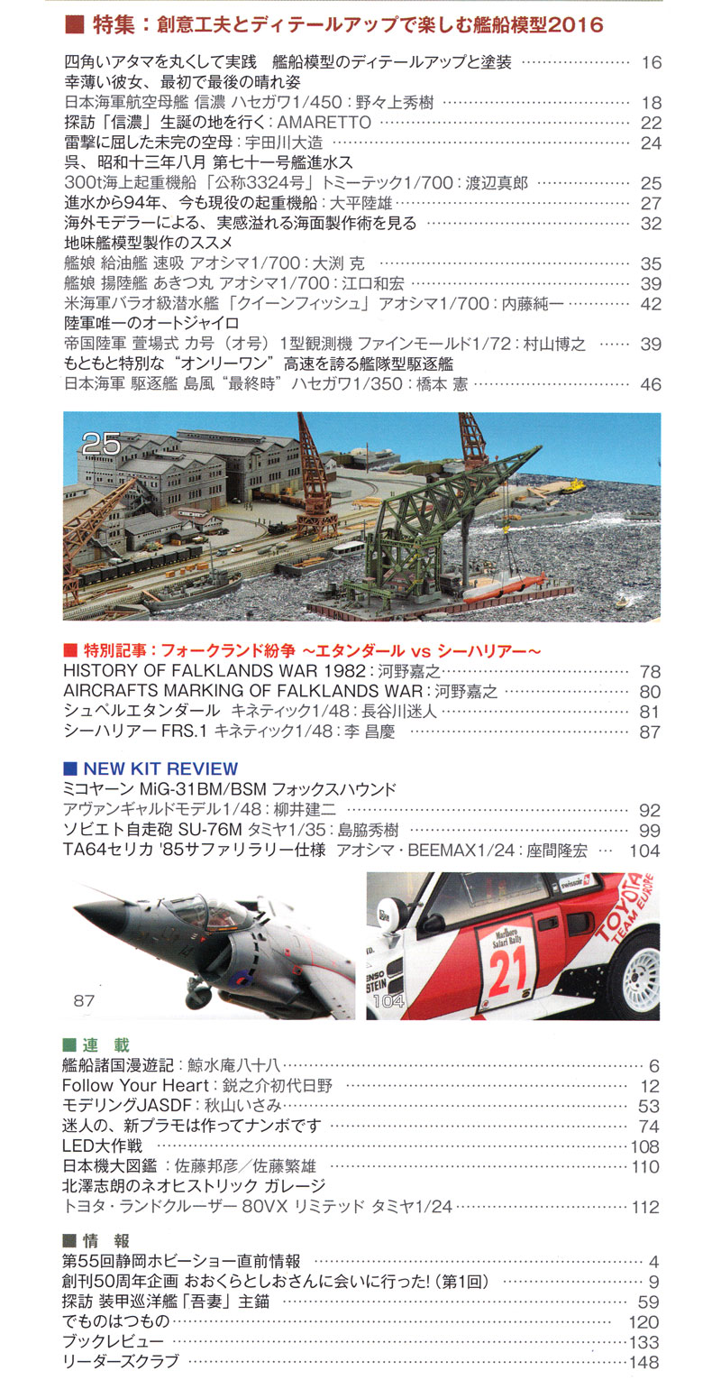 ■特集 : 創意工夫とディテールアップで楽しむ艦船模型 2016●艦船模型は、他のジャンルと比べるとスケールの比率が小さく、プラスチック製のインジェクションパーツでは省略されたり、ディテールしきれない箇所があり、これを補うため、エッチングなどを使ったディテールアップが艦船モデラーの中で広く浸透しています