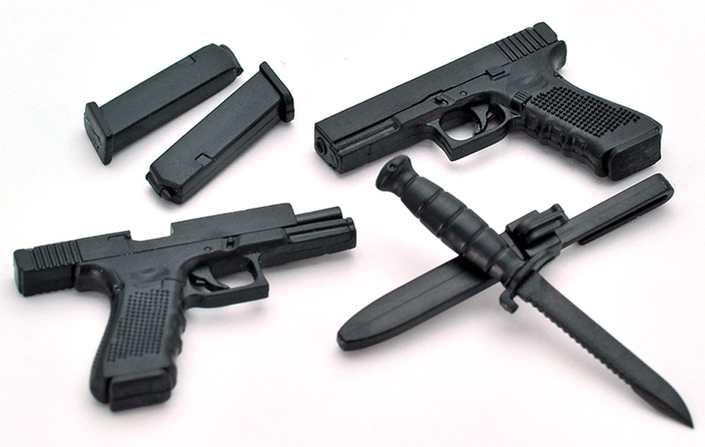 【 「グロック 17/18C タイプ」の製品内容について 】 ●当キットでは、スライド前進・後退状態をそれぞれ再現 ・ 18Cはストックとロングマガジンを装備した姿で、スライド上面のポートも再現 ・ 17連マグと33連マグの2種類、野戦ナイフとシースが付属します