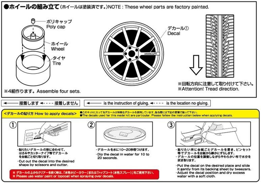 ●「ADVAN Racing RS」のスポークロゴ、カーモデルのボディに使用できるボディサイド用の「ADVAN (正・反転)」などのロゴなどを再現したデカールが付属。 (アオシマ ザ・チューンドパーツ No.45~48 共通)