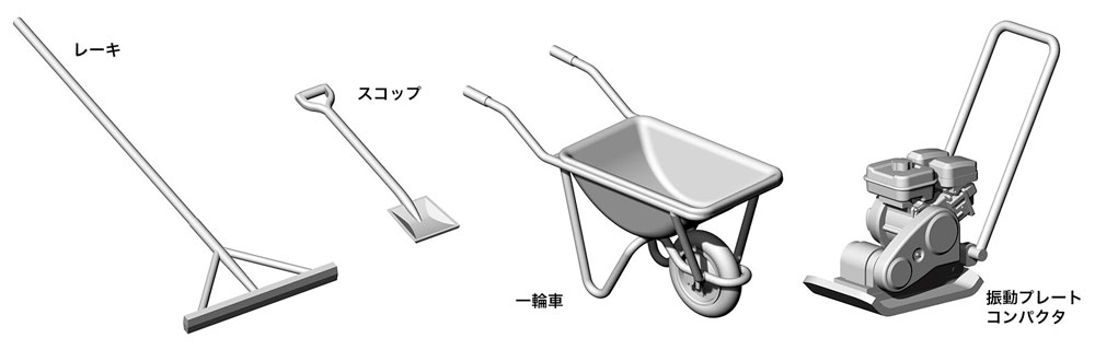 ●舗装工事のシチュエーションを再現した、作業員と機材のセットです。