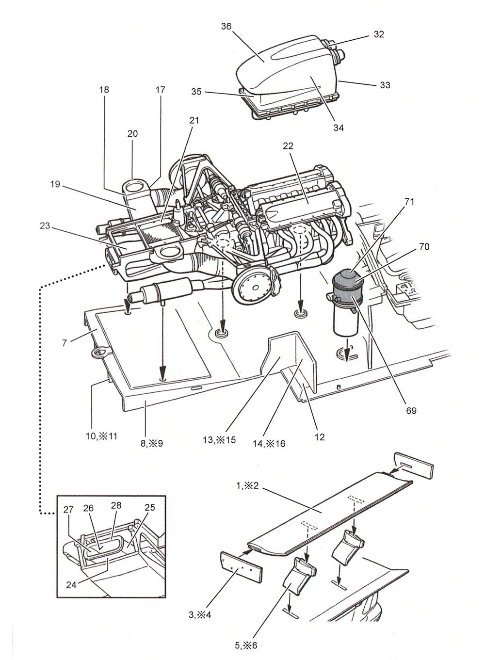 ●コクピット内からエアダクト、フロントユニット、リアディフューザー、エンジンユニット、リアウイングといった車体各所のカーボンパターンを再現した内容となっています。