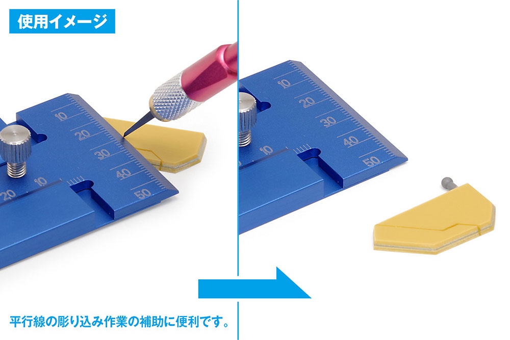 【 「HG スライド T定規」の製品内容について 】 ●プラスチック板の平行切り出しや模型部品への平行線の彫り込み作業などの補助に便利です。 ・ 取り回しにすぐれた小サイズボディは、アルミ製で軽量化と強度をバランスよく両立。 ・ 各部の目盛はレーザー彫刻で作成。 ・ 見やすく、かつ消えにくくなっております。 ・ 固定ネジをしめるネジ穴の位置でT定規がスライドする範囲を調節可能。