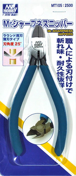 「Mr.シャープネスニッパー ラウンド両刃薄刃タイプ ニッパー (GSIクレオス Mr.ツール No. MT105 )」です【「Mr.シャープネスニッパー 両刃タイプ」について 】●プラモデルのゲート切断用ニッパーです。 ●刃の角度を25度で仕上げた薄刃によって、切断時の抵抗が小さく、軽い力で切ることができます。 ●また職人による鍛造仕様ですので耐久性に優れています。
