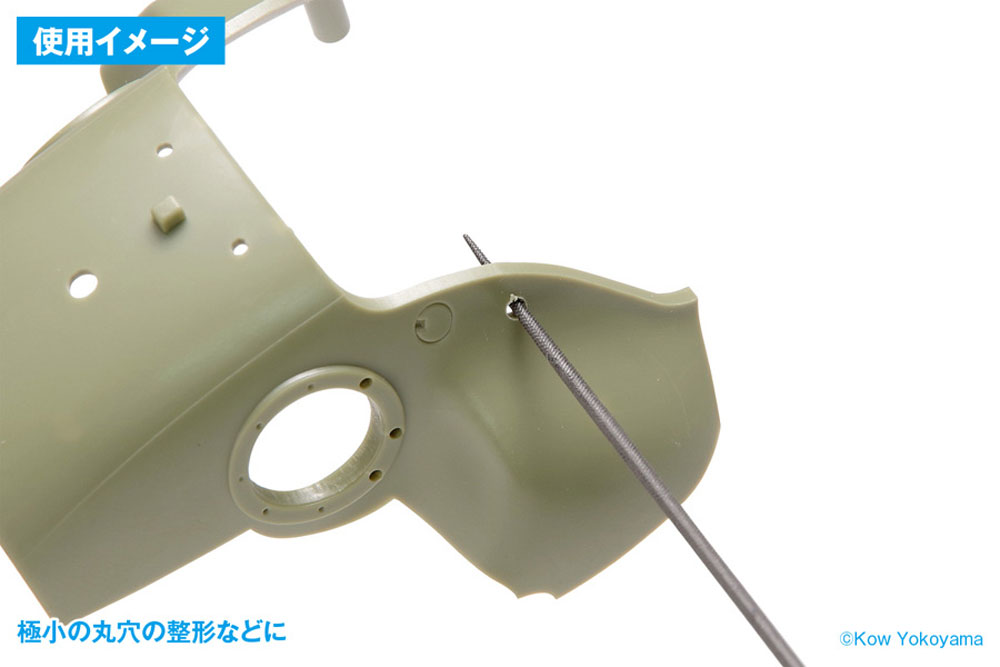 ●先端にかけてテーパーのついた針状の丸ヤスリで、極小の丸穴の整形や小サイズフィギュアの髪、服のしわなどの加工に便利です。