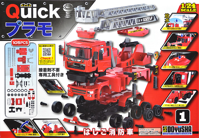 「はしご消防車 プラモデル (童友社 Quickプラモ No.001 )」です●「はしご消防車」1/24スケールで再現したプラスチックモデル組立キット 【はしご消防車 について 】●新感覚のクイックプラモが登場します。 【はしご消防車 のプラモデル内容について 】●接着剤不要ではめ込みとプラネジを使用し、専用工具にて組み立てます。 ・ ライトの点灯、3種類のサウンドなどギミックも満載(電池は別売りとなっております)。 【はしご消防車 仕様 】●完成時サイズ:全長:390mm/全幅:140mm/高さ:210mm ●完成時最大サイズ:全長:588mm/全幅:155mm/高さ:605mm