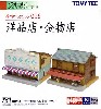 昭和の時代に見られたレトロな風情を持った建物、時計店と酒屋を1/150で再現、大理石造りと木造作りの2階立て建物