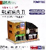 昭和初期に建築された板壁に瓦葺屋根の小型商店2軒を1/150で再現、片方は昭和3~40年頃に改装された姿、もう片方は見世蔵造りの趣を残した姿